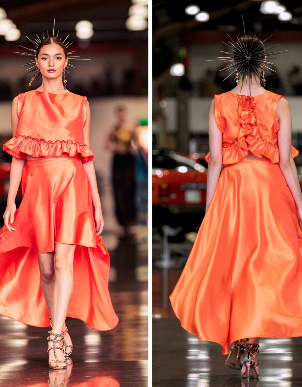 Make a bold statement in the Desert Rose, a handcrafted satin dress in a striking tangerine hue. Featuring a high-low hem, waist ruffle, and dramatic open-back with cascading details, this dress is designed to turn heads. Perfect for special events, this piece blends elegance with fierce individuality.