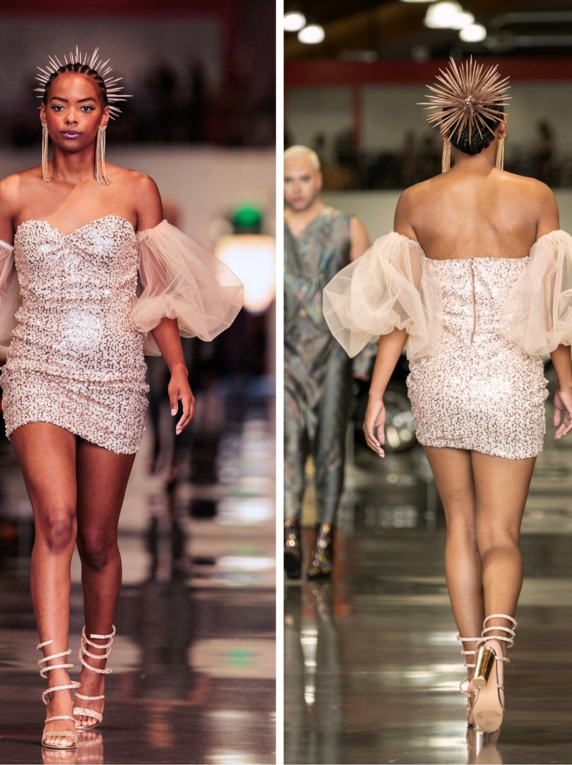 Shimmer with every step in the Rose Mercury Gown, a luminous pink-silver off-the-shoulder dress crafted for high-impact glamour. Featuring a sleek fit and a bold, puffy arm, this showstopper blends futuristic edge with classic couture drama.